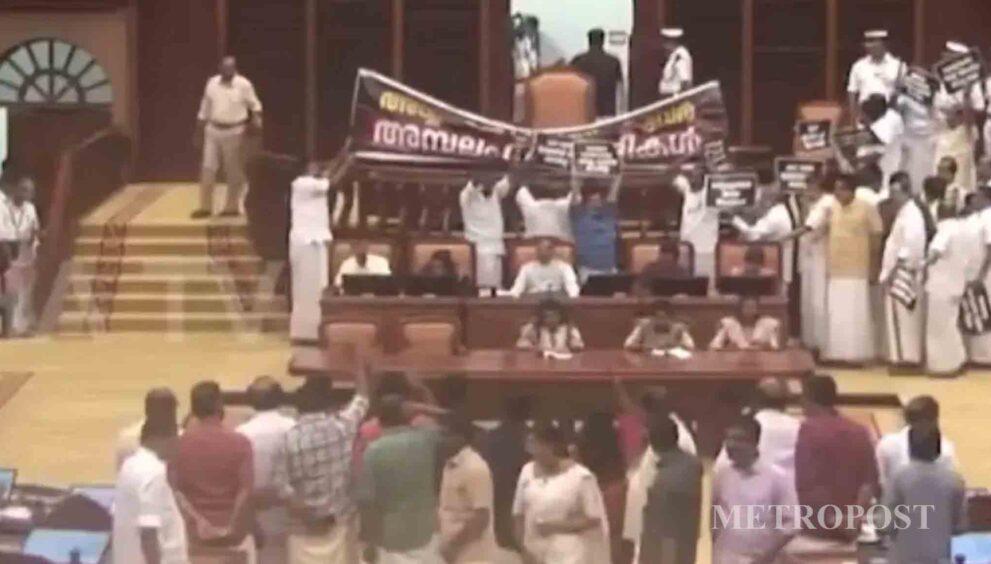 ഇന്നലെ സഭയുടെ ഗാലറിയില് മുഴുവന് വിദ്യാര്ത്ഥികള് ഉണ്ടായിരുന്നു. അപ്പോഴാണ് പ്രതിഷേധം ബഹളം വെച്ചത്. സ്പീക്കറുടെ മുഖം മറച്ചുകൊണ്ടായിരുന്നു പ്രതിഷേധം. ഇതാണോ കുട്ടികള് കണ്ട് പഠിക്കേണ്ടതെന്നും ഇത് ജനാധിപത്യത്തിന് ഭൂഷണമല്ലെന്നും സ്പീക്കര് പറഞ്ഞു. ബഹളത്തിനിടയില് ചോര് ഹേ ചോര് ഹേ മുഴുവന് ചോര് ഹേ എന്ന് പ്രതിപക്ഷത്തെ മന്ത്രി വി ശിവന്കുട്ടി ആക്ഷേപിക്കുകയും ചെയ്തു. സഭാനടപടികള്ക്ക് തടസ്സം വരുത്തിക്കൊണ്ട് പ്ലക്കാര്ഡും ബാനറുകളുമായി പ്രതിപക്ഷം പ്രതിഷേധിക്കുകയാണ്.