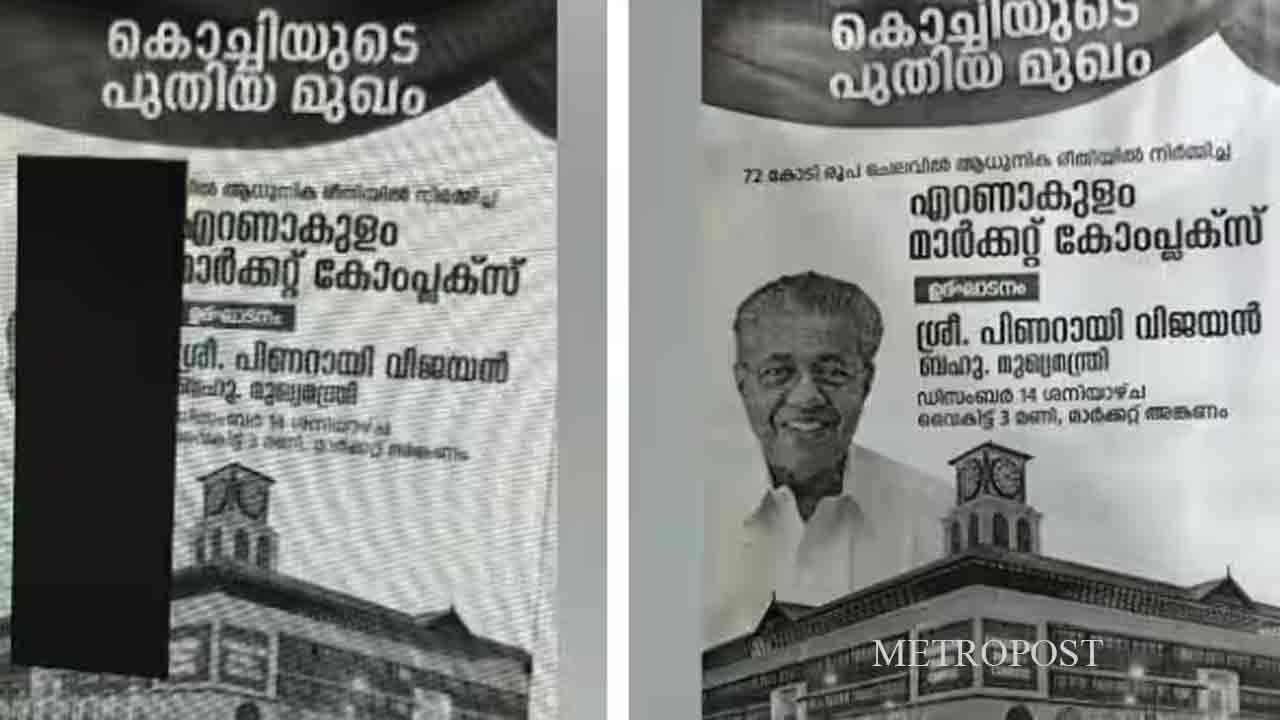 കോഴിക്കോട്: മുഖ്യമന്ത്രി പിണറായി വിജയന്റെ മുഖം മറച്ച പരസ്യം പ്രസിദ്ധീകരിച്ച് ലീഗ് മുഖപത്രം ചന്ദ്രികയുടെ ഇ-പേപ്പര്. ചന്ദ്രികയുടെ കോഴിക്കോട് എഡിഷണില് അച്ചടിച്ച എറണാകുളം മാര്ക്കറ്റ് കോംപ്ലക്സ് ഉദ്ഘാടന