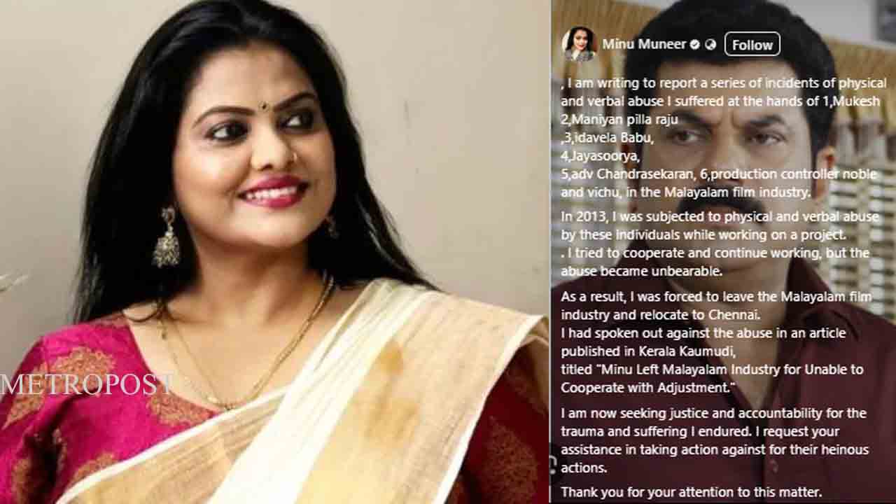 കൊച്ചി: മലയാളത്തിലെ പ്രമുഖ നടന്മാര്ക്കെതിരെ ആരോപണവുമായി നടി മിനു മുനീര്. സോഷ്യല് മീഡിയ പ്ലാറ്റ്ഫോമായ ഫേസ്ബുക്കിലൂടെയാണ് മിനു ആരോപണമുന്നയിച്ചത്. നടന്മാരായ മുകേഷ്,ജയസൂര്യ,മണിയന് പിള്ള രാജു,ഇടവേള ബാബു എന്നിവരും