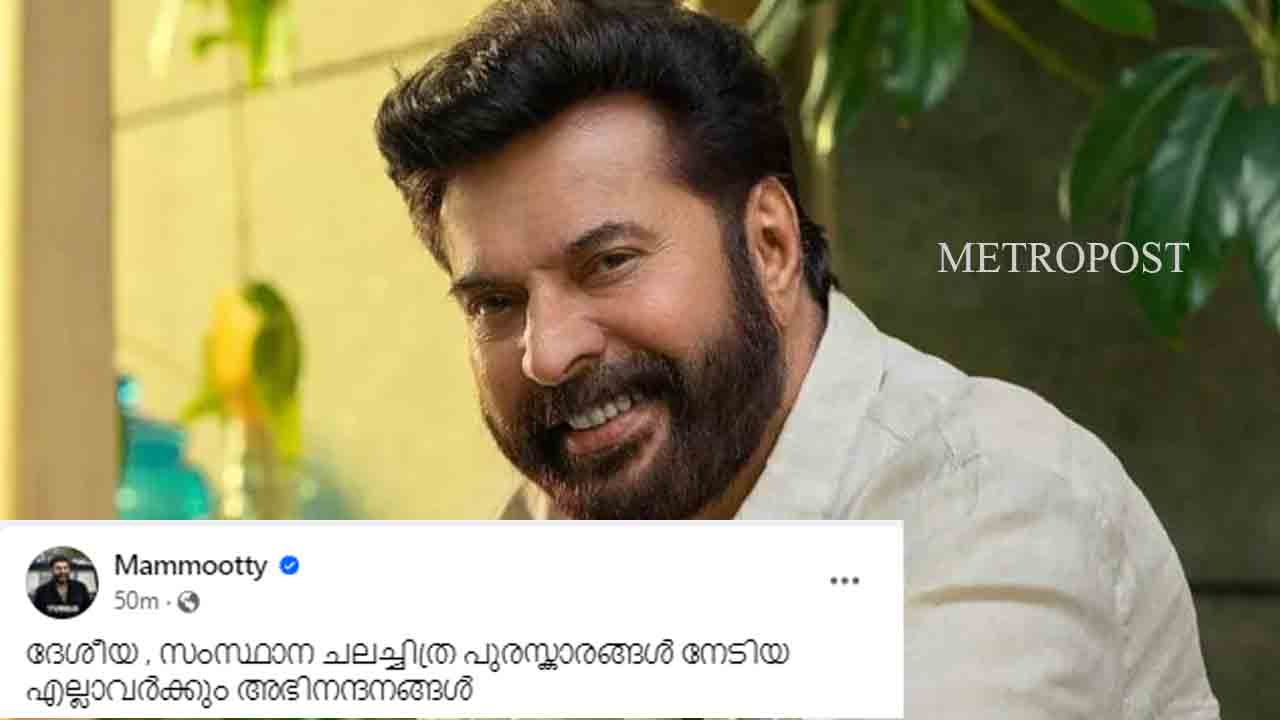ദേശീയ,സംസ്ഥാന ചലച്ചിത്ര പുരസ്കാരങ്ങള് നേടിയ ജേതാക്കളെ അഭിനന്ദിച്ച് നടന് മമ്മൂട്ടി. സോഷ്യല് മീഡിയയിലൂടെ കുറിപ്പ് പങ്കുവെച്ചായിരുന്നു അഭിനന്ദനം അറിയിച്ചത്. ഇന്ന് പ്രഖ്യാപിച്ച ദേശീയ,സംസ്ഥാന പുരസ്കാരങ്ങള്ക്കായുള്ള മത്സരത്തില് മമ്മൂട്ടിയും