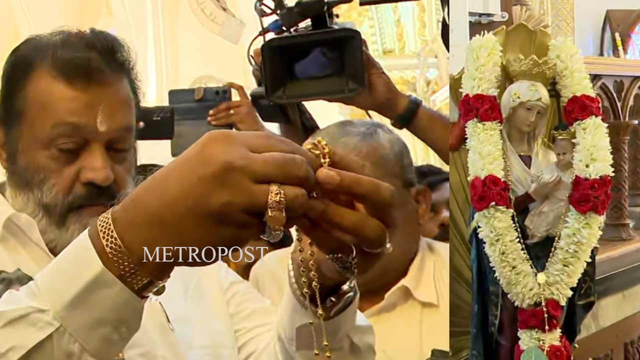 തൃശൂര്: കേന്ദ്ര സഹമന്ത്രി സുരേഷ് ഗോപി ലൂര്ദ് മാതാ പള്ളിയില് എത്തി മാതാവിന് സ്വര്ണ കൊന്ത സമര്പ്പിച്ചു. സുരേഷ് ഗോപി തന്നെയാണ് മാതാവിന് കൊന്ത അണിയിച്ചത്. തെരഞ്ഞെടുപ്പ്