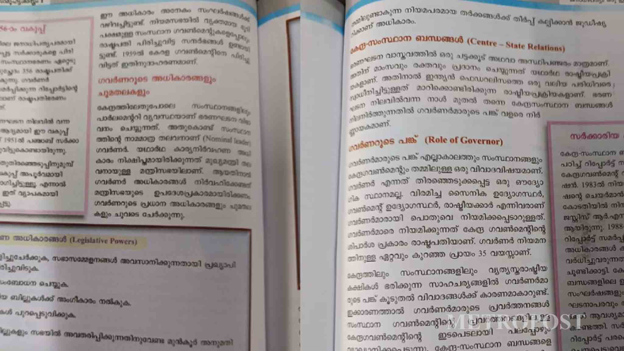 തിരുവനന്തപുരം: പത്താം ക്ലാസ് സാമൂഹ്യശാസ്ത്രം രണ്ടാം ഭാഗത്തില് ഗവര്ണറുടെ അധികാര പരിധി ഉള്പ്പെടുത്തിയ പാഠപുസ്തകം പുറത്തിറക്കി. ജനാധിപത്യം; ഒരു ഇന്ത്യന് അനുഭവം’ എന്ന പാഠഭാഗത്തിലാണ് ഉള്പ്പെടുത്തിയിരിക്കുന്നത്. ഗവര്ണര്