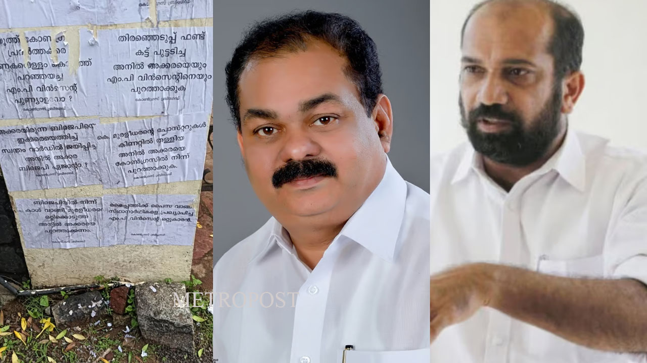 തൃശൂര്: തൃശൂരിലെ കോണ്ഗ്രസില് പോസ്റ്റര് യുദ്ധം അവസാനിക്കുന്നില്ല. കോണ്ഗ്രസ് നേതാക്കളായ അനില് അക്കര, എം പി വിന്സന്റ് എന്നിവര്ക്കെതിരെ ഡിസിസി ഓഫീസിന് മുന്നില് പോസറ്ററുകള് പ്രത്യക്ഷപ്പെട്ടു. തൃശൂര്