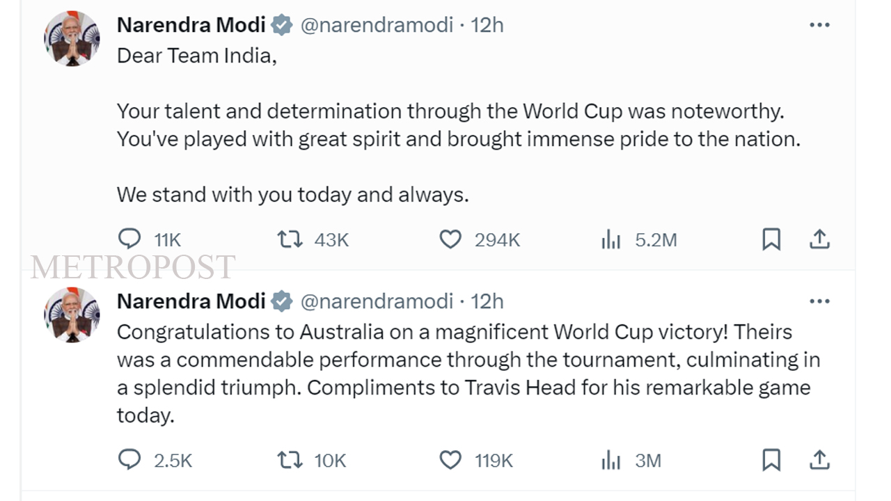 ക്രിക്കറ്റ് ലോകകപ്പ് കിരീടം ഓസ്ട്രേലിയ സ്വന്തമാക്കിയെങ്കിലും രാജ്യത്തിന് അഭിമാനമായ ടീം ഇന്ത്യയ്ക്ക് അഭിനന്ദനമറിയിച്ച് പ്രധാനമന്ത്രി നരേന്ദ്രമോദി ട്വീറ്റ് ചെയ്തു. ലോകകപ്പിലുടനീളം ഇന്ത്യന് ടീം കാഴ്ച്ച വച്ച പ്രകടനത്തെയും