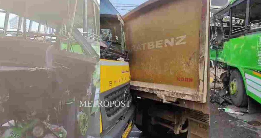 കൊച്ചി കാക്കനാട് ബസും ലോറിയും കൂട്ടിയിടിച്ച് യാത്രക്കാരിക്ക് ദാരുണാന്ത്യം; ഏഴുപേര്ക്ക് പരിക്ക്